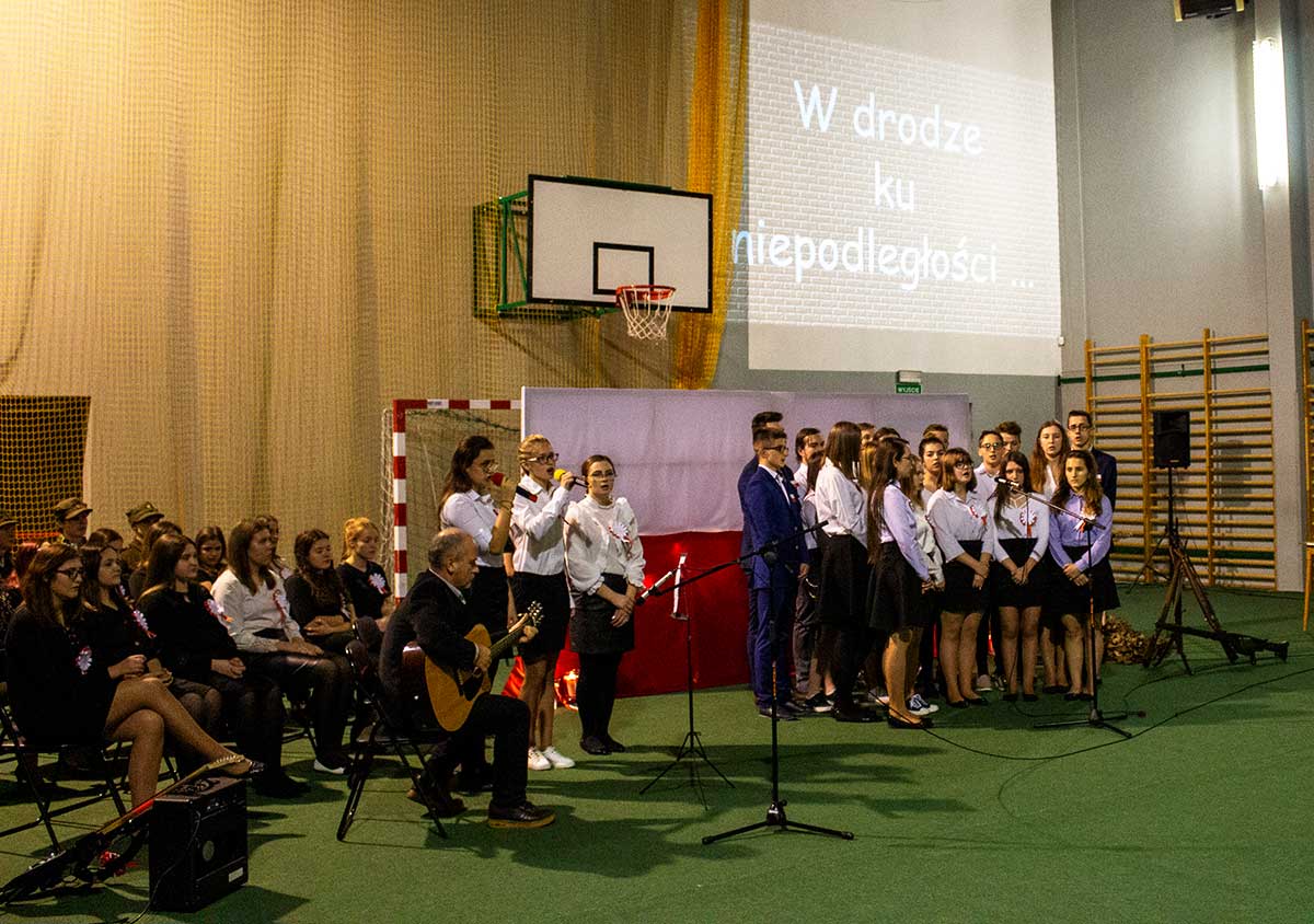 Młodzież przygotowała program i ćwiczyła pod kierunkiem polonistów, którzy także wybrali odpowiednie dokumenty historyczne, materiał filmowy i teksty literackie.