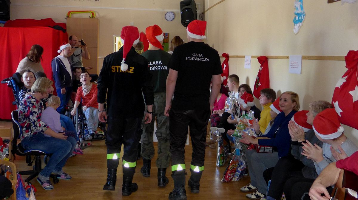 Czerwone czapki z białym futerkiem to nie element umundurowania, ale przy tak radosnej okazji były niezbędne. Długo przed Mikołajem mundurowa młodzież z wszystkich klas gromadziła zawartość pięknie ozdobionych paczek, które dostojny Mikołaj mógł wręczyć nie posiadającym się z radości chatkowiczom. Długo przed tym wyjątkowym dniem kadeci pukali do firm, gromadzili zabawki, maskotki, słodycze, materiały i przybory plastyczne. Słodkościami mogli od razu poczęstować dzieciaki świętujące w mikołajowej scenerii, przy dźwiękach świątecznej muzyki, a zawartość innych paczek posłuży im na dłużej.