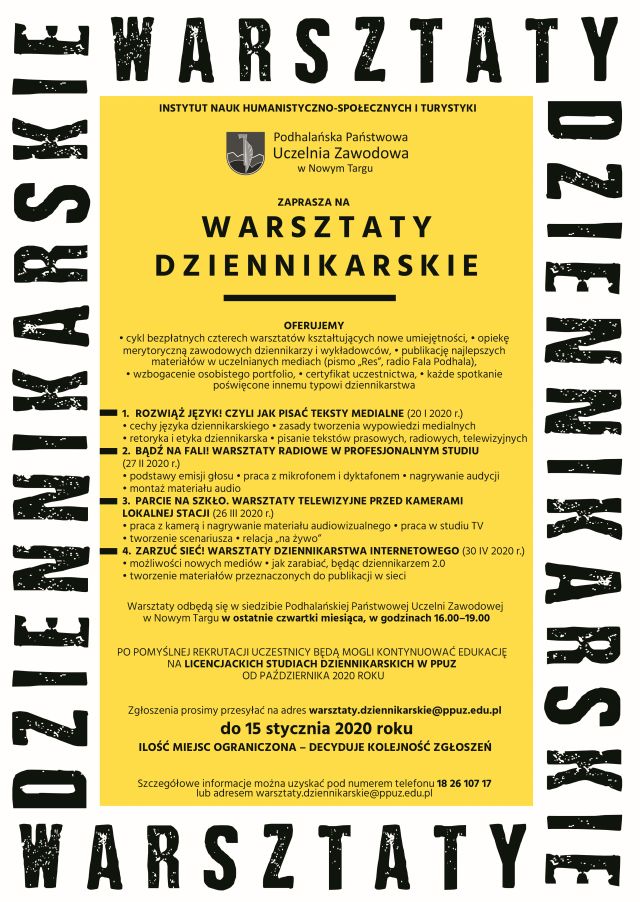 Swoje uczestnictwo należy zgłosić na adres warsztaty.dziennikarskie@ppuz.edu.pl do 15 stycznia 2020 roku. Liczba miejsc ograniczona – decyduje kolejność zgłoszeń.