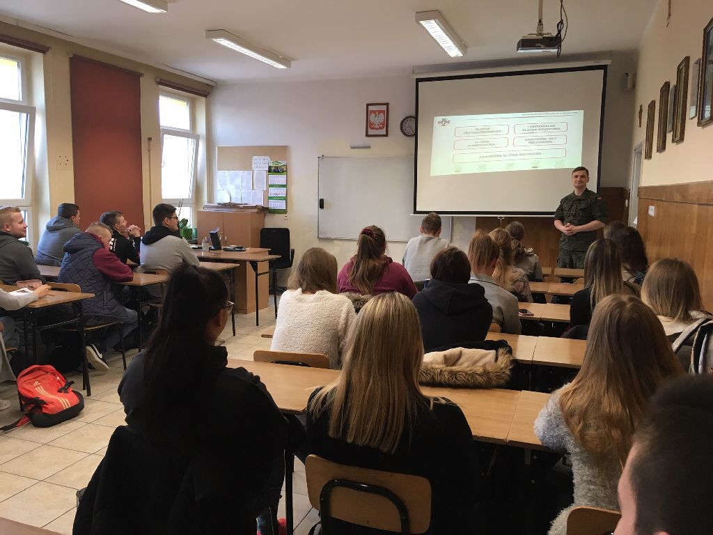 Oficer Wydziału Rekrutacji opowiadał uczniom o funkcjonowaniu Sił Zbrojnych RP, o służbie przygotowawczej i zawodowej, oraz o tym jak zostać żołnierzem. Zachęcał młodzież do wstępowania w szeregi Armii Polskiej (również dziewczęta) przy tym przedstawił korzyści jakie niesie służba w wojsku. Uczniowie z dużym zainteresowaniem i zaangażowaniem uczestniczyli w spotkaniu.