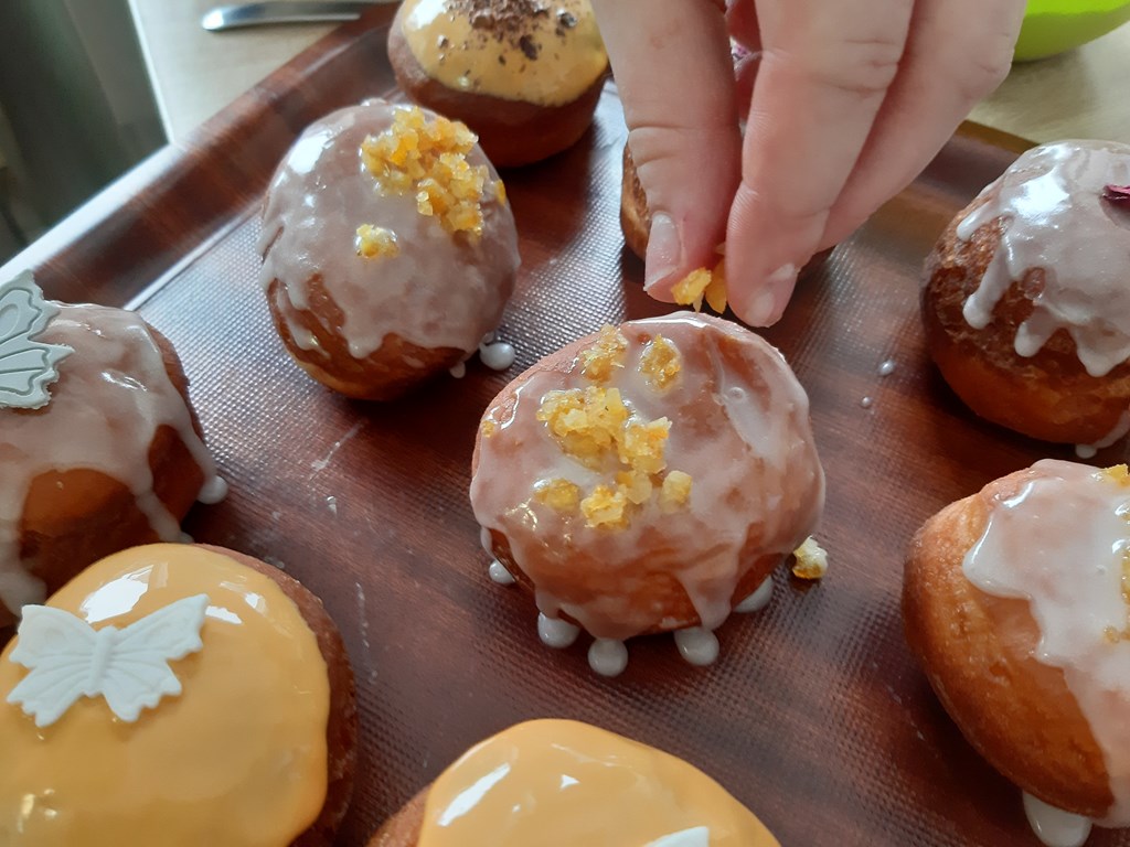 Na szkolnej kuchni pachniały faworki i gorące pączusie nadziewane: marmoladą, powidłami, wiśniami, żurawiną, borówkami, jabłkami, budyniem, serem, orzechami, czekoladą, masą kakaową czy ajerkoniakiem. Na specjalne zamówienie pojawiły się też pączki nadziane słonym karmelem.