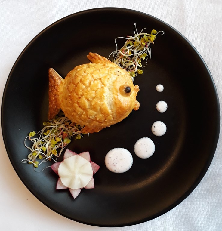 „Łososia pod pierzynką ze szczawiu i bryndzy zapiekanego w cieście francuskim z dodatkiem sosu jogurtowo-rzodkiewkowego"