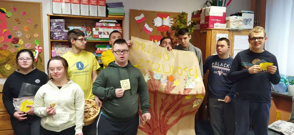 Następnie każdy wylosował „uśmiechniętą buźkę”, na której miał wpisane życzliwe zdanie (mógł je zostawić dla siebie lub podarować innym) oraz wyzwanie na nadchodzący weekend. Okaże się kto był życzliwy dla swoich bliskich i wykonał to zadanie. Dzięki życzliwym uczniom ze Szkoły Przysposabiającej do Pracy, którzy na zajęciach przygotowali ciasteczka, wszyscy mogli skosztować pysznych słodkości. Teraz szkolny korytarz zdobią drzewa życzliwości.