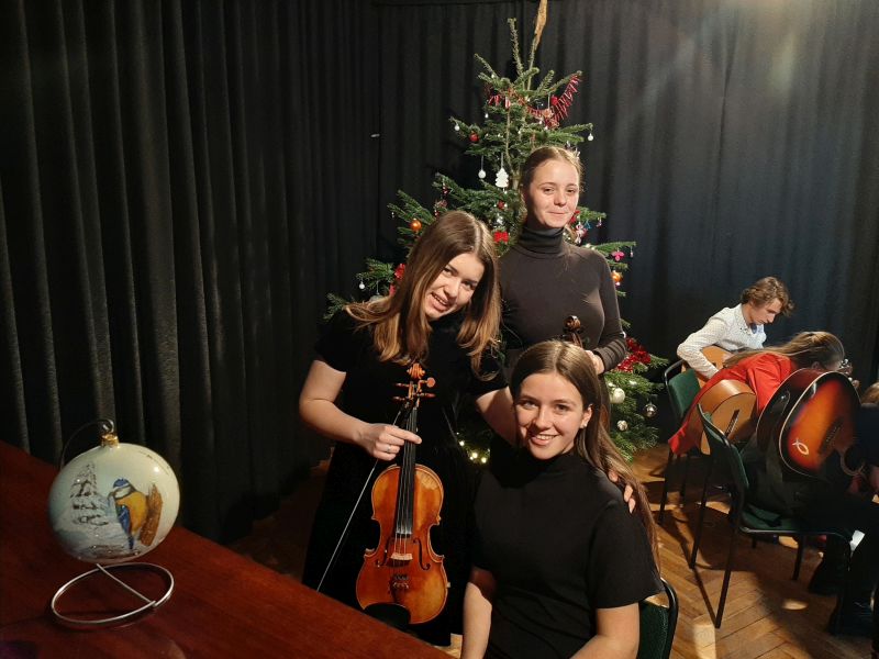 Miłym akcentem było również nagranie przez grupę muzyczną działającą przy Szkolnym Wolontariacie Młodzieżowym, kolęd i pastorałek. Na filmie można między innymi usłyszeć utwory świąteczne takie jak… Cicha Noc, Lulajże Jezuniu, Szkrzypi wóz…. Nie zabrakło pięknego brzmienia takich instrumentów jak: skrzypce, basy, gitary, paninio, fortepian.