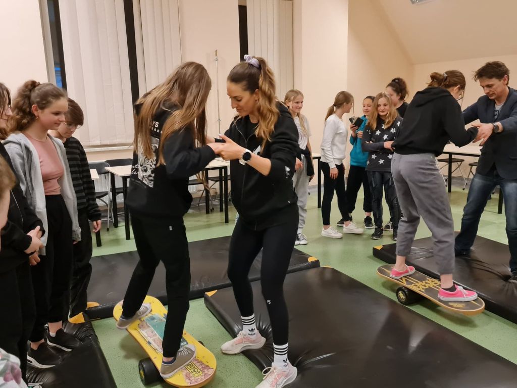 Polska snowboardzistka, uczestniczka trzech olimpiad sportów zimowych, chorąży polskiej reprezentacji, zwyciężczyni zawodów Pucharu Świata, złota medalistka 28 Uniwersjady, aktualna mistrzyni Polski – Aleksandra Król z Nowego Targu dzieliła się wrażeniami z olimpiad, prezentowała profesjonalny sprzęt snowboardzisty, zachęcała do uprawiania sportu i przeprowadziła ćwiczenia sprawnościowe z uczniami na równoważni. O modzie, kolekcjach i pokazach opowiadała Elżbieta Krzemińska – Owczarz z Zakopanego. Projektantka mody i stylistka wspominała swoje początki w branży i fascynację wzornictwem podhalańskim, mówiła o powstawaniu kolekcji oraz o etapach projektowania sukni na konkurs Miss Universe dla Miss Polonia 2009. Poświęciła też trochę czasu na opowieści o swoich pasjach, wśród których ważne miejsce stanowi film. O organizacji występów gwiazd, trasach koncertowych, nagrywaniu płyt i działaniach marketingowych mówił manager zespołu Future Folk - Janusz Pilch z Zakopanego. Wspominał czasy, kiedy zafascynował się muzyką i własne sukcesy na tym polu. Zachęcał uczniów do odkrywania pasji i dążenia do ich realizacji.
