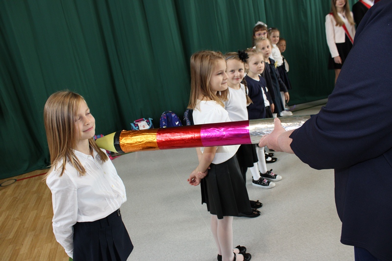 Dzieci z pierwszej klasy przygotowane przez Celinę Błaszczyk z werwą prezentowały swoje umiejętności recytatorskie, wokalne i taneczne. Po wprowadzeniu pocztu sztandarowego oraz odśpiewaniu hymnu szkoły złożyły uroczystą przysięgę. Dyrektor szkoły Barbara Stala uroczyście pasowała dzieci na uczniów. W podziękowaniu rodzicom pierwszaki wykonały układ do piosenki pt. „Jeruzalema”, który w czasach pandemii stał się globalnym wiralem. Urszula Kułach wykorzystując sprzęt Laboratoriów Przyszłości urządziła fotograficzne atelier, by upamiętnić tą uroczystości.