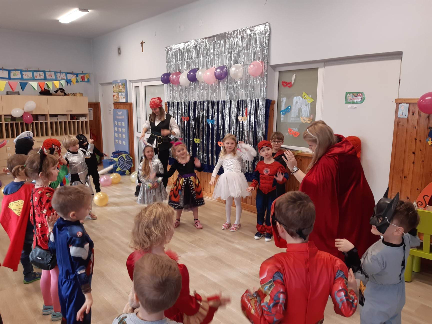 Wystrój sal był bajkowy i niepowtarzalny, wprowadził dzieci w radosny nastrój, zachęcając do wspólnej zabawy. Tego dnia odwiedzili nas studenci z PPUZ w Nowym Targu, którzy przygotowali dla dzieci szereg niespodzianek. Przedszkolaki uczestniczyły w grach zręcznościowych, wesołych pląsach, konkursach, zabawach z wykorzystaniem chusty animacyjnej. Tańce z balonami oraz zabawy muzyczno- ruchowe wprawiły wszystkich w karnawałowy nastrój. Dzieci bawiły się wyśmienicie. Przedszkolaki przebrane były za bohaterów znanych bajek. Można było spotkać: wróżki, księżniczki, motylki, piratów, policjantów, strażaków...nie sposób zliczyć i wymienić wszystkie postacie. Wspólna zabawa przyniosła wiele radości naszym przedszkolakom, spędziły dzisiejszy dzień w miłej i radosnej atmosferze. Na zakończenie czekał na dzieci poczęstunek przygotowany przez rodziców, za co serdecznie dziękujemy. Podziękowania należą się również studentom z PPUZ za zaangażowanie i udział w tegorocznym balu.