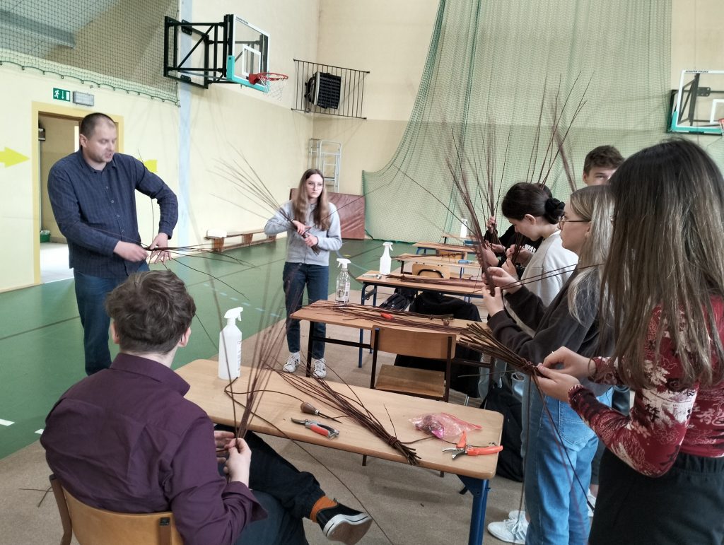 Obróbka wikliny to trudna sztuka, ale zajęcia były bardzo ciekawe i uczniowie misternie wyplatali kosze i koszyczki.