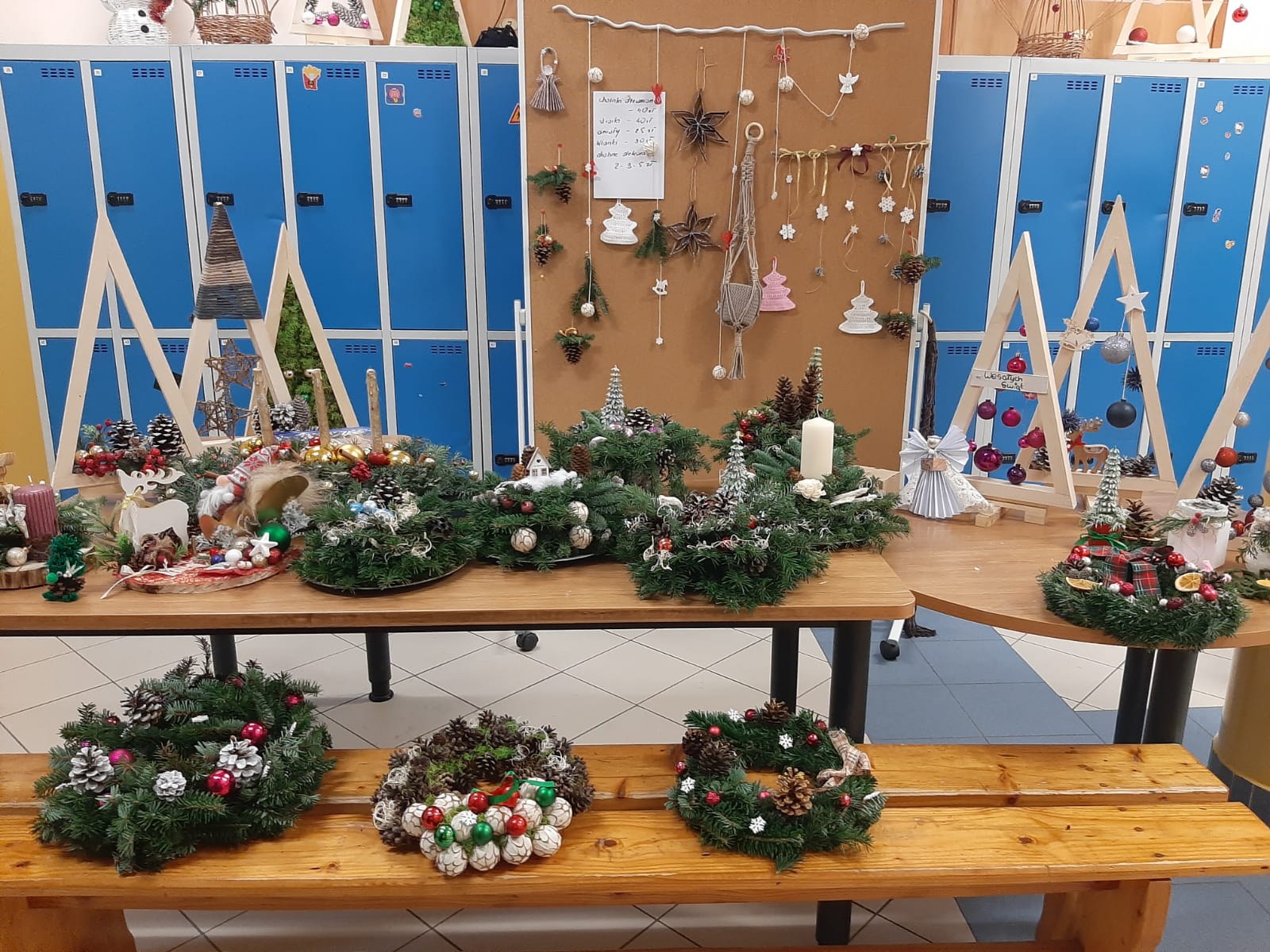 Szkoła już jest udekorowana naturalnymi ozdobami wykonanymi własnoręcznie przez uczniów: stroiki, drewniane choinki, anioły z wikliny.