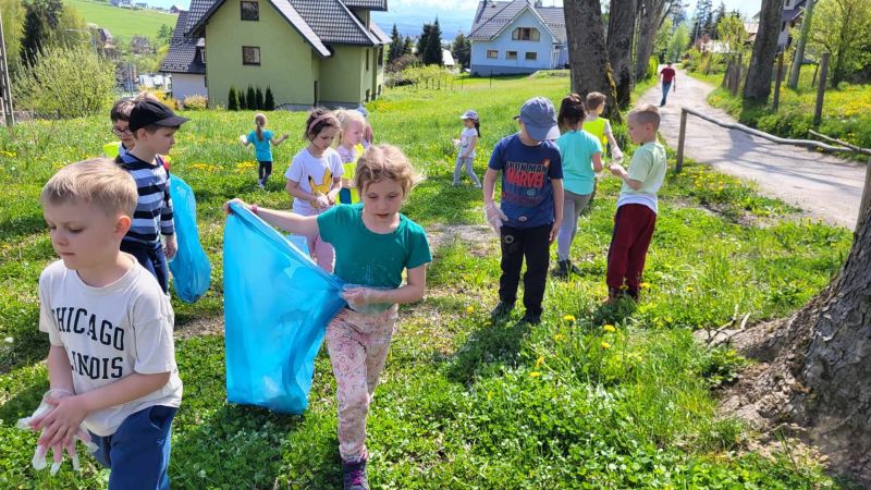 Przedszkolaki zaopatrzeni w jednorazowe rękawiczki, worki na śmieci i pozytywnie zmotywowani wyruszyli posprzątać okolice wokół przedszkola. Udział dzieci w tej akcji z pewnością przyczyni się do ukształtowania wrażliwości na potrzeby środowiska naturalnego oraz nawyku dbałości o nie.