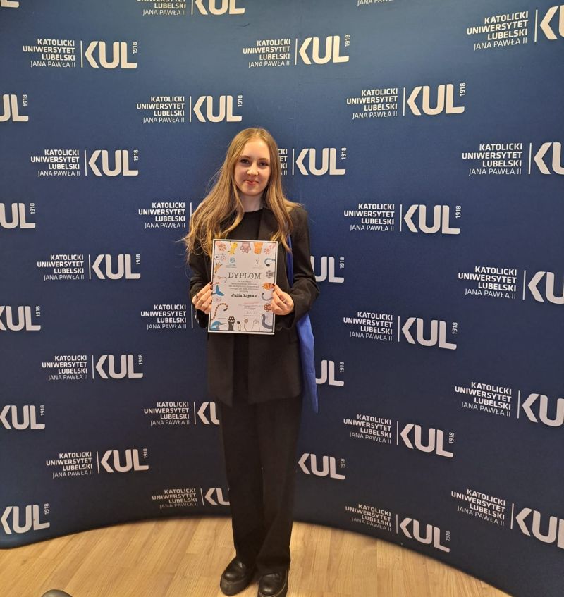 Uczennica wzięła udział w gali wręczenia nagród na Katolickim Uniwersytecie Lubelskim. Jedną z nich było uczestniczenie w warsztatach kreatywnego pisania w języku angielskim prowadzonych przez dr. Jerzego Skwarzyńskiego. Jak podsumowała i ujęła to nasza młoda autorka: „Warsztaty dodały mi mnóstwo wiary w siebie oraz swoje umiejętności na dwóch bardzo ważnych dla mnie płaszczyznach – twórczej oraz językowej. Cieszę się, że miałam okazję uczestniczyć w tak fascynujących zajęciach jak te na Katolickim Uniwersytecie Lubelskim”.