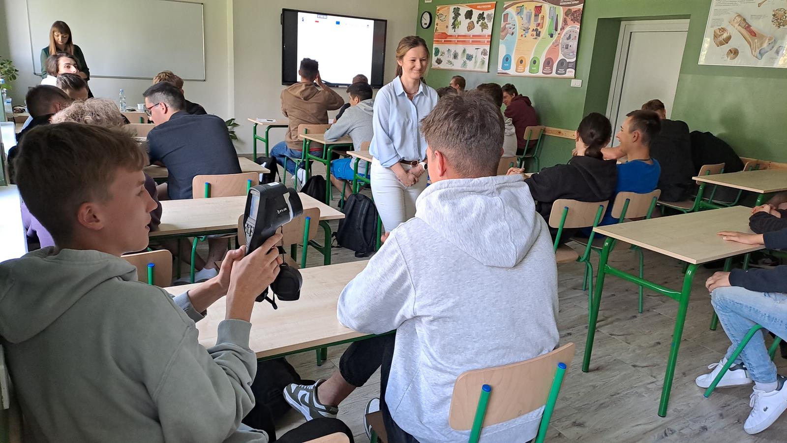 29 maja 2024 r. w miała miejsce seria wykładów prowadzonych przez ekodoradców z Urzędu Miasta Nowy Targ. Podczas spotkań uczniowie klas czwartych technikum mieli okazję poszerzyć swoją wiedzę w zakresie wymiany źródeł ciepła, termomodernizacji i instalacji odnawialnych źródeł energii. Panie prelegentki zwróciły szczególną uwagę na następujące aspekty: czym jest niska i wysoka emisja, jakie są rodzaje substancji zanieczyszczających powietrze, jak ukształtowanie terenu wpływa na jakość powietrza, jakie zapisy znajdują się w lokalnej uchwale antysmogowej dla Nowego Targu, na czym polega efektywność energetyczna budynków, jak wygląda audyt energetyczny budynku – https://kalkulatorczystepowietrze.kape.gov.pl/, jakie są zalety i wady kotłów gazowych, na pellet, zgazowujących drewno oraz elektrycznych, jakie produkty spełniają określone standardy środowiskowe i są uznawane za ekologiczne – https://lista-zum.ios.edu.pl/bepub/ben001.aspx, z jakich dofinansowań można skorzystać z budżetu miasta, jakie są dostępne dotacje na terenie miasta Nowy Targ. Na zakończenie wykładu uczniowie mieli także okazję przetestować kamerę termowizyjną.
